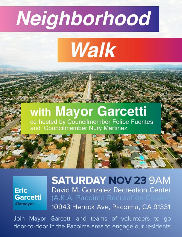 Mayor Eric Garcetti will be walking and knocking on doors, in PACOIMA.