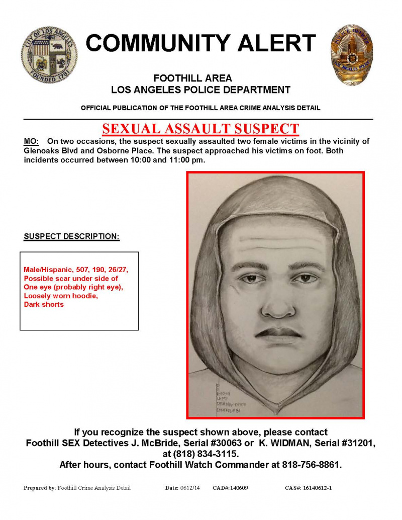 On two occasions, the suspect sexually assaulted two female victims in the vicinity of Glenoaks Blvd and Osborne Place. The suspect approached his victims on foot. Both incidents occurred between 10:00 and 11:00 pm.