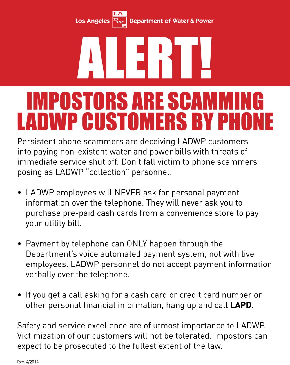 Safety and service excellence are of utmost importance to LADWP. Victimization of our customers will not be tolerated. Impostors can expect to be prosecuted to the fullest extent of the law.