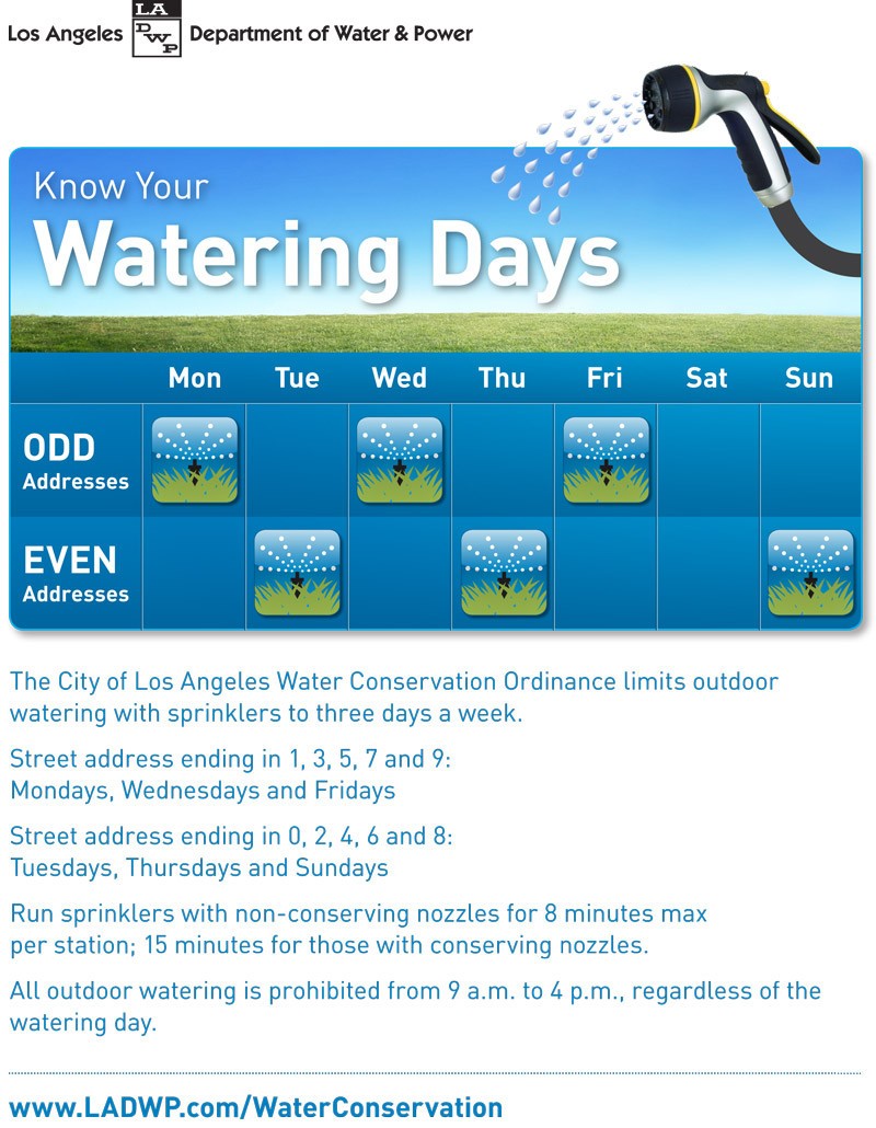 The City of Los Angeles Water Conservation Ordinance limits outdoor watering with sprinklers to three days a week.