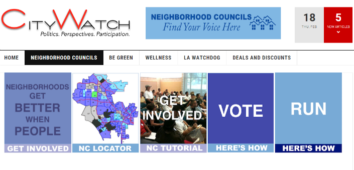The new site contains links the EmpowerLA elections site and will feature articles about Neighborhood Councils, their impact on the City and why Angelenos should run and vote in Neighborhood Council elections this year. With hundreds of thousands of readers citywide as well as a national audience, CityWatch is looking to raise the visibility and influence of Neighborhood Councils in Los Angeles.