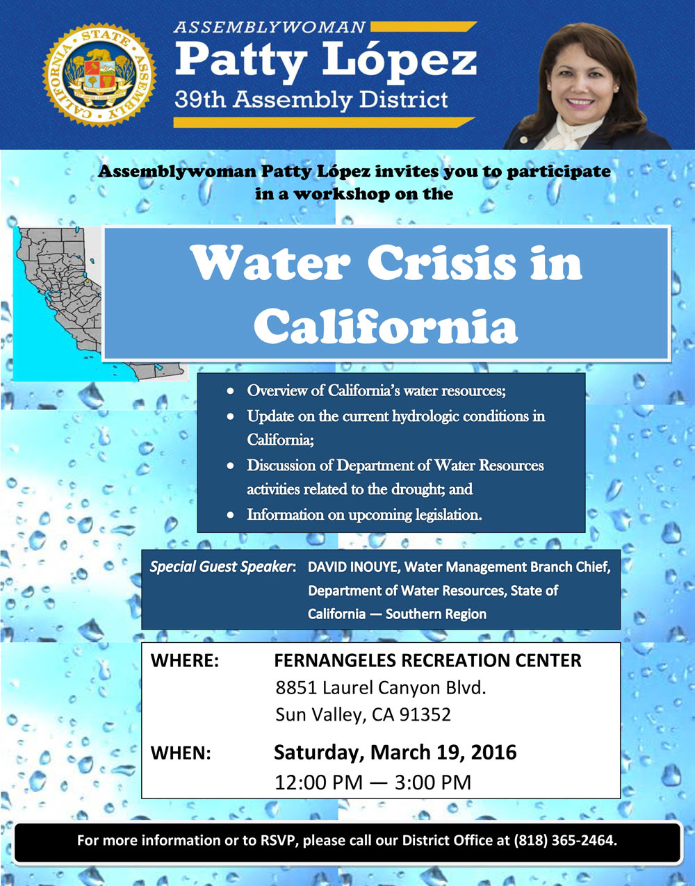 Assemblywoman Patty López invites you to participate in a workshop on the Water Crisis in California Saturday, March 19, 2016 12:00 PM — 3:00 PM Fernangeles Recreation Center 8851 Laurel Canyon Blvd Sun Valley, CA 91352