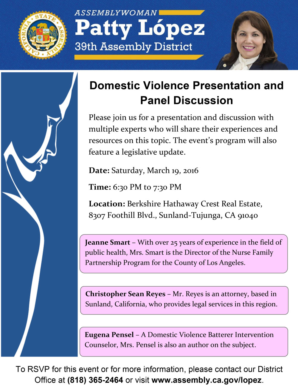 To RSVP for this event or for more information, please contact our District Office at (818) 365-2464 or visit www.assembly.ca.gov/lopez.