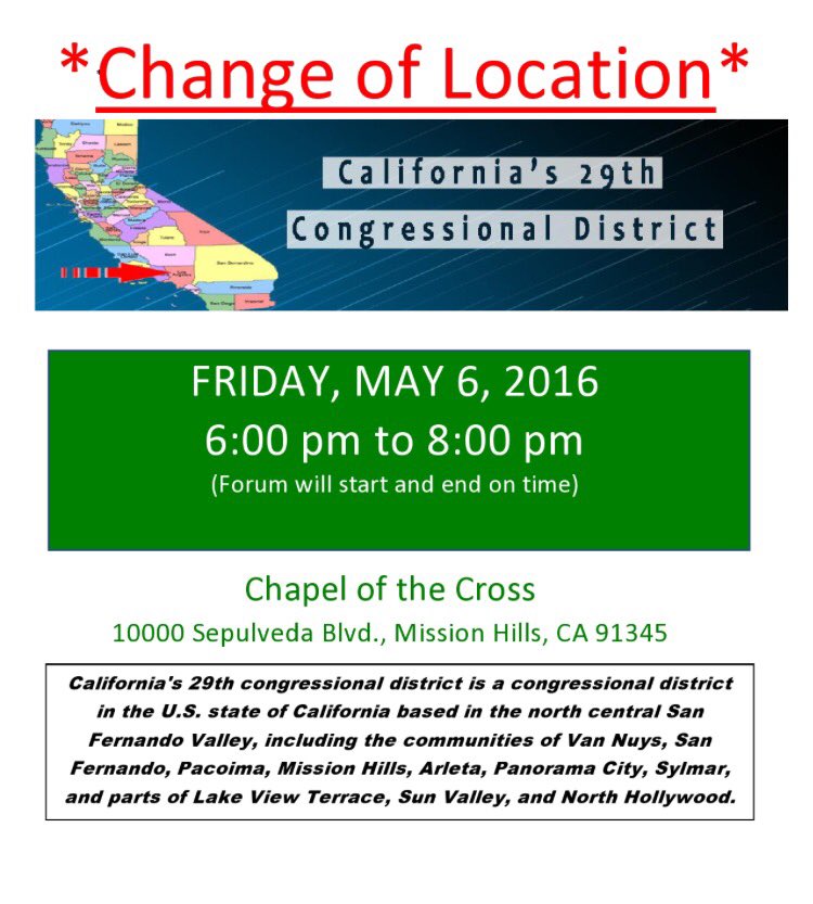 California’s 29th Congressional District is based in the Northeast San Fernando Valley of Los Angeles. It includes the communities of Arleta, Granada Hills, Lake Balboa, Lake View Terrace, Mission Hills, North Hills, North Hollywood, Pacoima, Panorama City, Sun Valley, Sylmar, Valley Glen, Valley Village, Van Nuys, and the City of San Fernando.