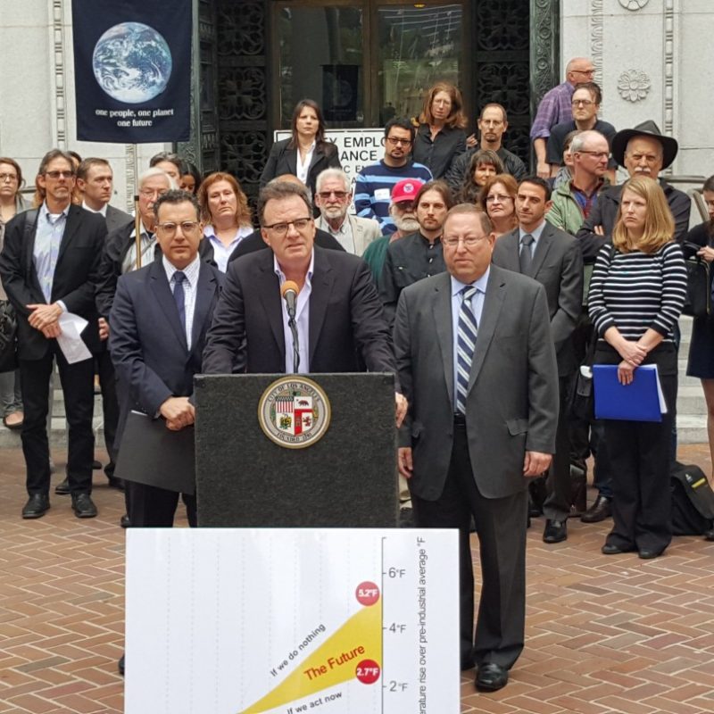On Wednesday, May 11 (practically the eve of one of the largest planned climate change marches in Los Angeles history), the Los Angeles City Council unanimously approved a motion to establish the City’s official target of reducing its greenhouse gas emissions to 80% below 1990 levels by 2050, and directing City departments to create climate action plans to meet the interim goals — stronger than the California State goals — set by Mayor Garcetti in Executive Directive #7, his Sustainable City pLAn: