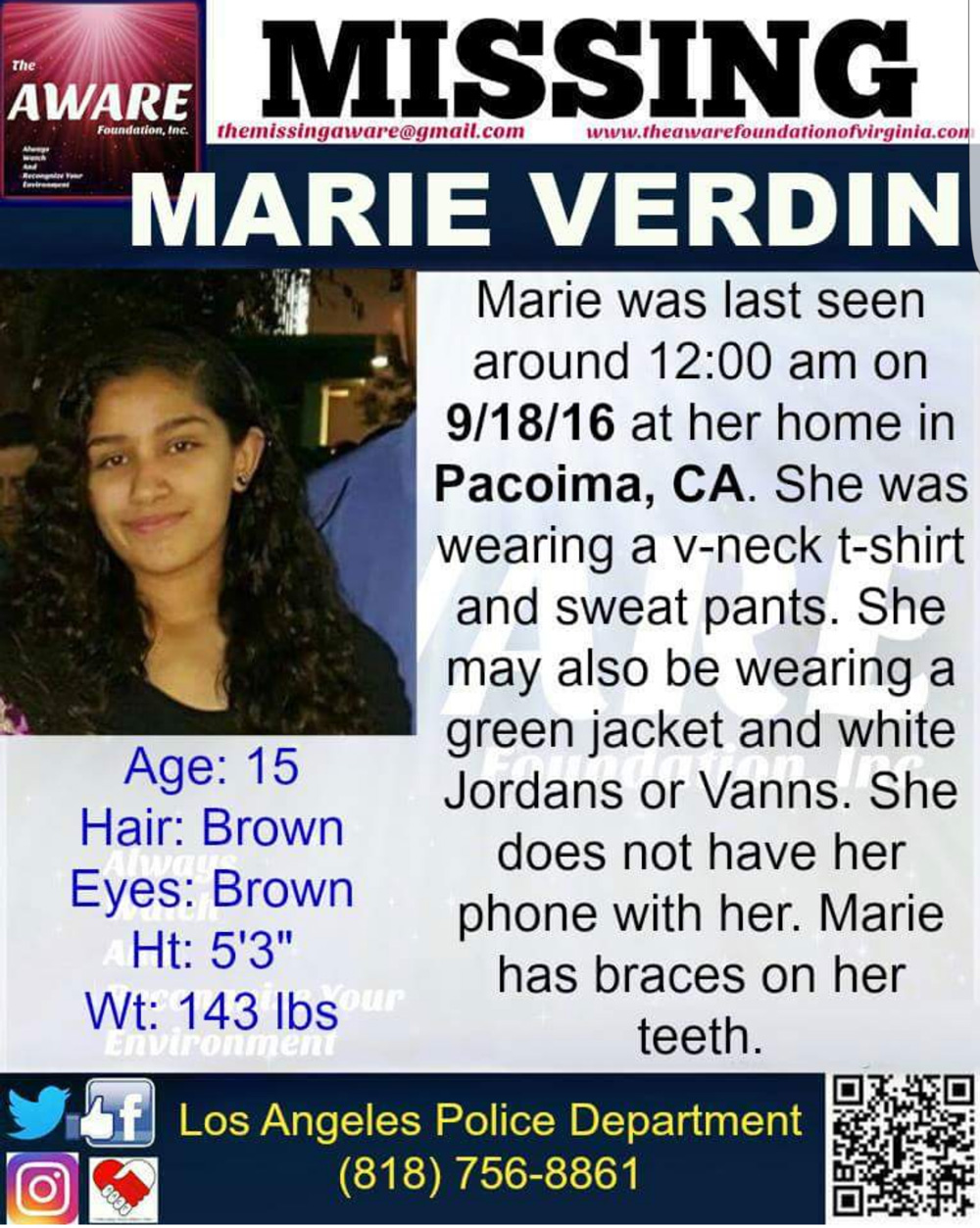 Marie Verdin was last seen around 12:00 am on 9/18/16 at her home in Pacoima, CA. She was wearing a v-neck t-shirt and sweat pants. She may also be wearing a green jacket and white Jordans or Vans. she does not have her phone with her. Marie has braces on her teeth.
