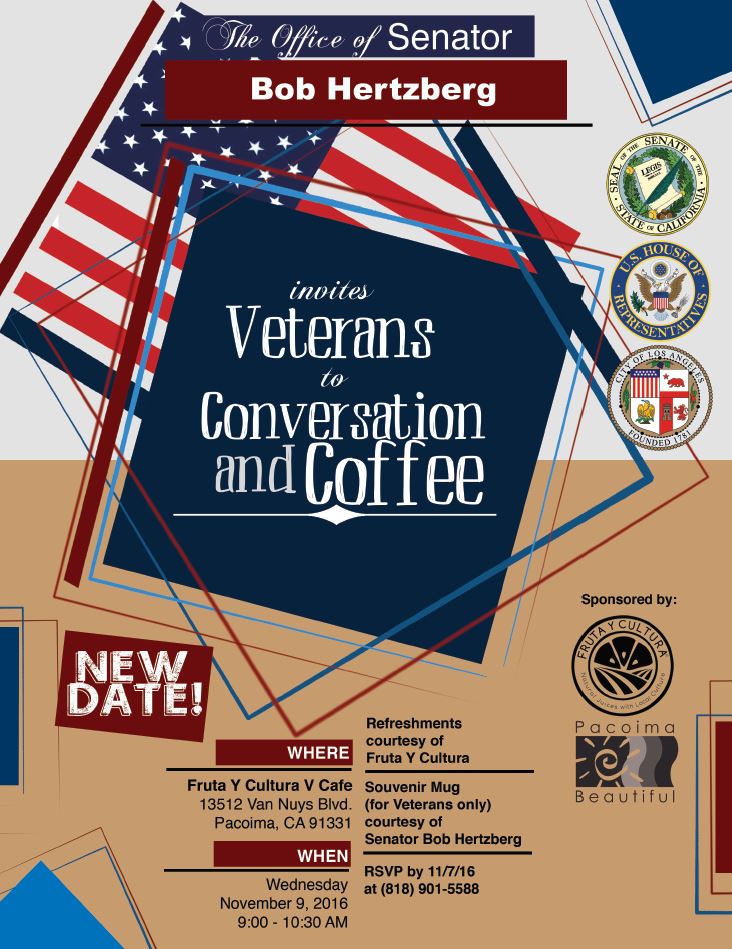 Senator Hertzberg will be hosting a Coffee at Pacoima City Hall for Veterans. We hope that service men and woman will join us for coffee and conversation. Please share with all the honorable veterans in the community.