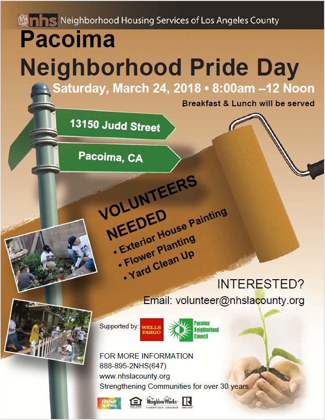You are welcomed to join the Neighborhood Housing Services for a community clean up cosponsored by the Pacoima Neighborhood Council!