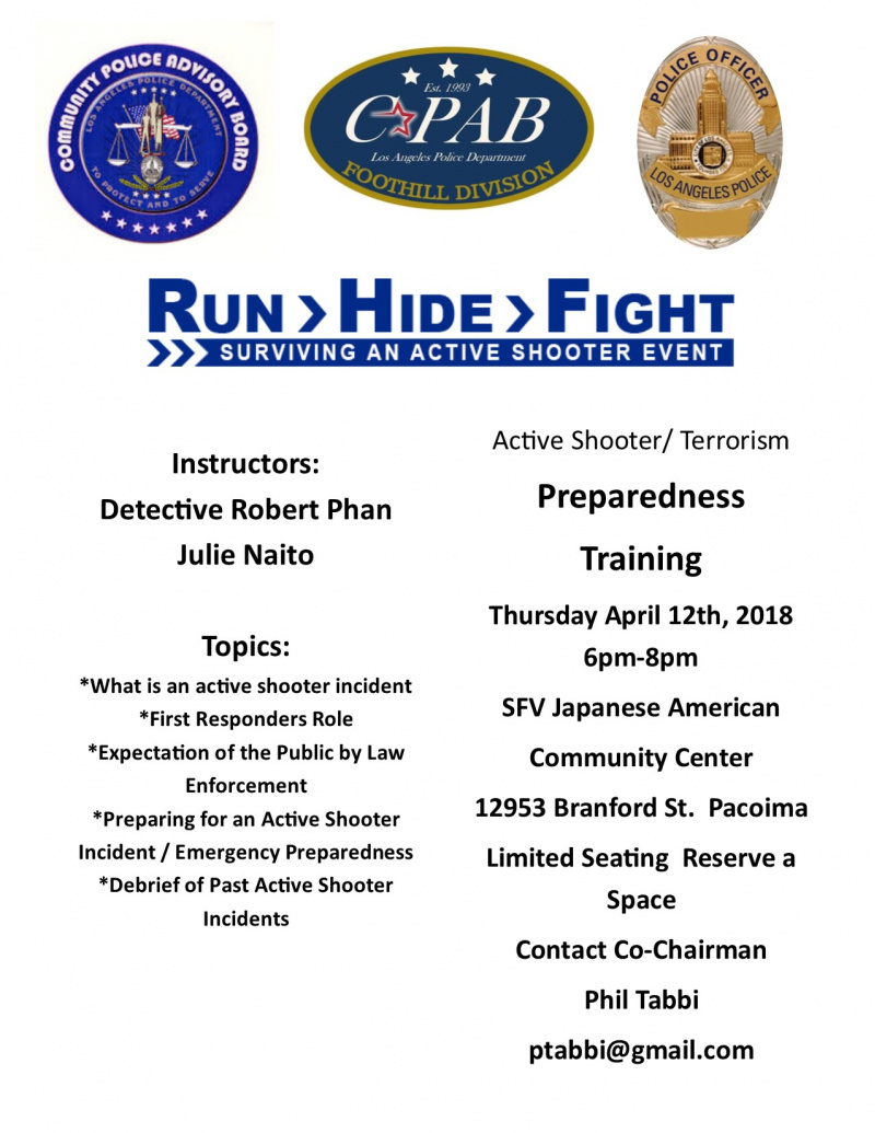 The LAPD Foothill Division along with CPAB is hosting an Active Shooter/Terrorist Preparedness Training .